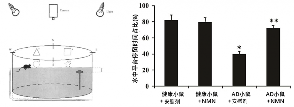 结果显示,NMN显著恢复了阿尔兹海默症小鼠的认知能力。在一项名为“莫里斯水迷宫(Morris water maze)”的测试中,小鼠需要尽快地通过空间认知和记忆能力找到隐藏在水下的落脚平台并停留在上面。患上阿尔兹海默病的小鼠由于认知能力的下降,在平台上的停留时间大幅降低,而NMN显著提高了停留时间。